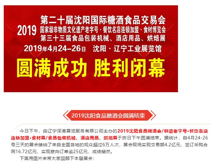 | 2019沈陽糖酒會/非遺老字號·餐飲名店連鎖加盟·食材展/食品包裝機械、酒店用品、烘焙展勝利閉幕! | |